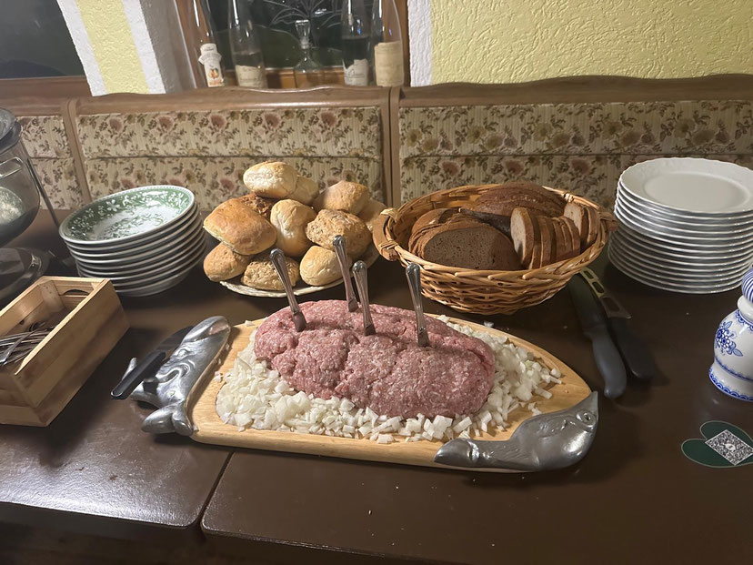 Für alle, die es herzhaft mögen: unsere Spezialitätenplatten bieten Klassiker wie frisches Mett mit Zwiebeln, dazu knackige Brötchen und Bauernbrot. Ein rustikaler Genuss, der bei geselligen Runden immer gut ankommt.